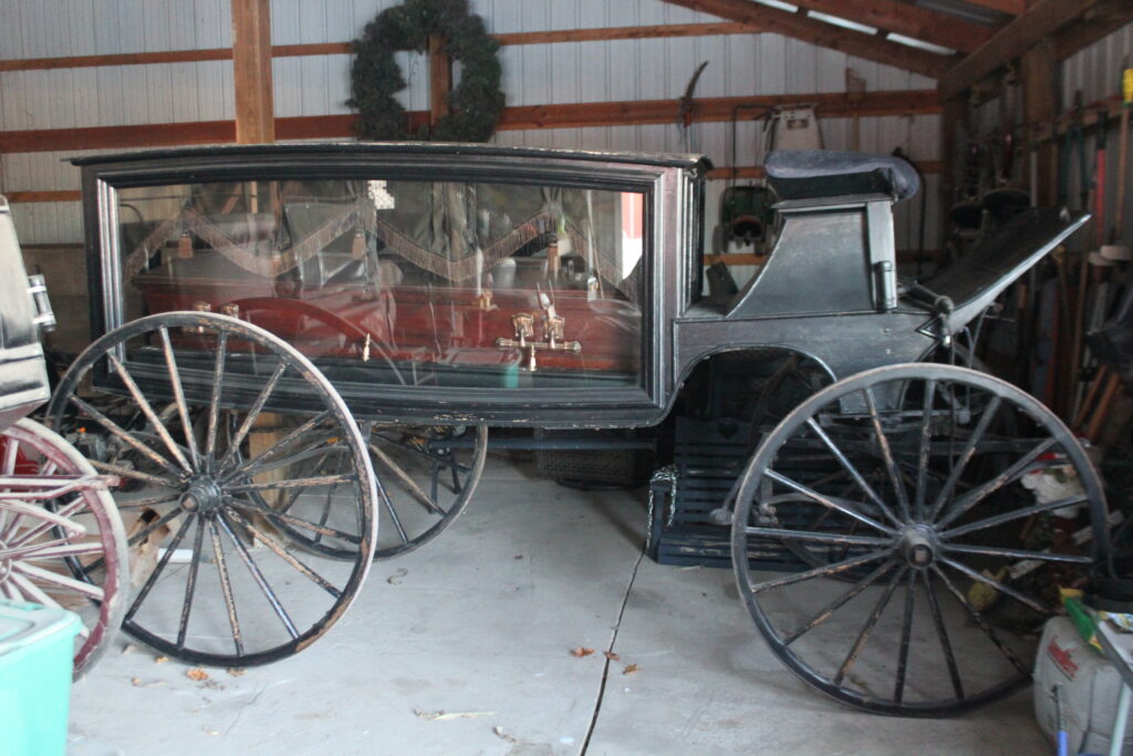 1893 Hearse. The hearse fits a full-sized casket. Has a cover and tongue and shafts.