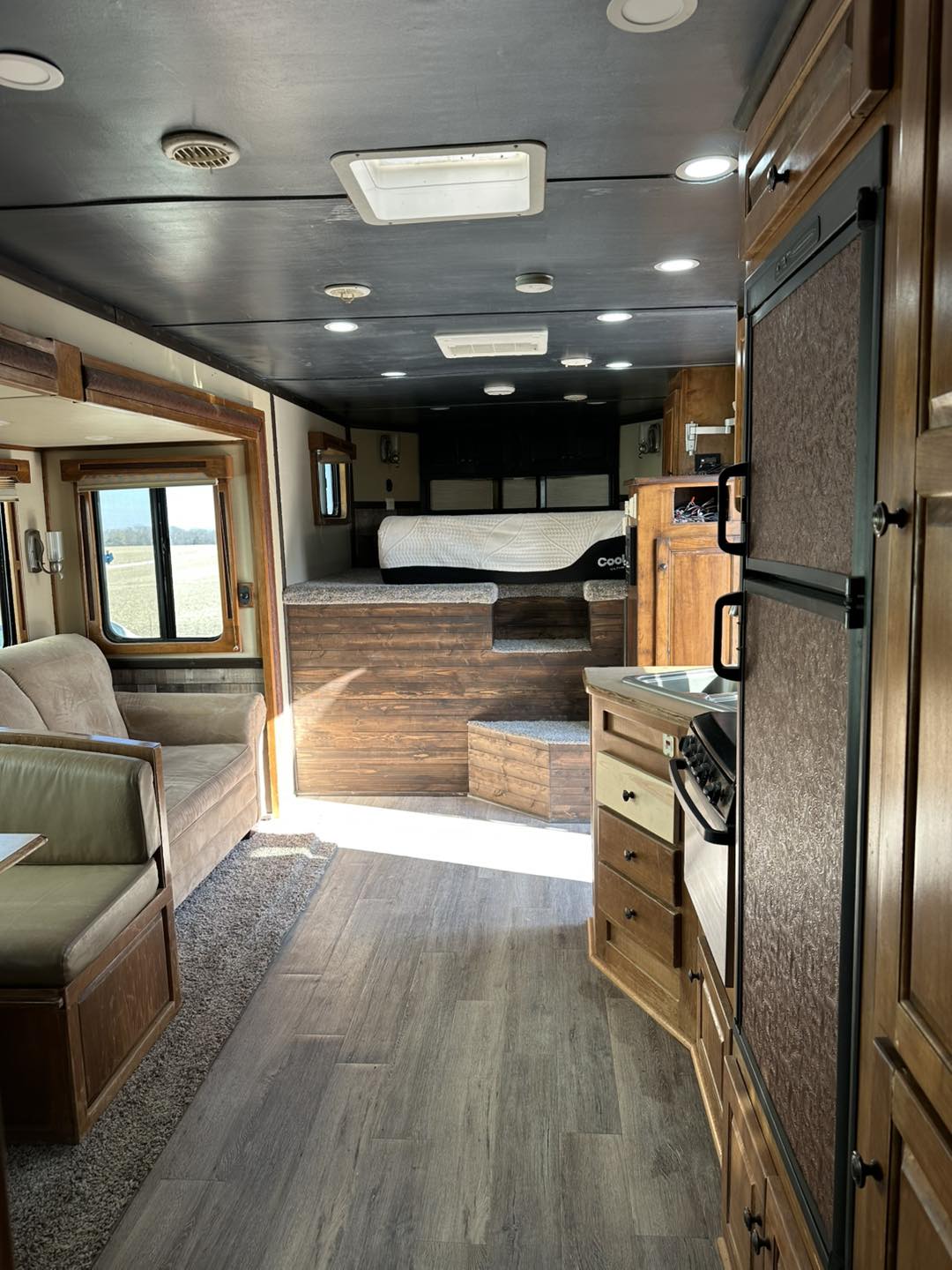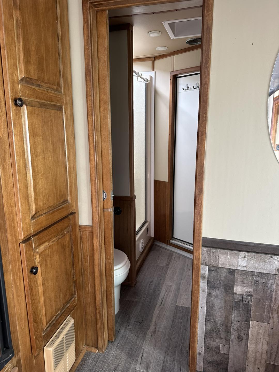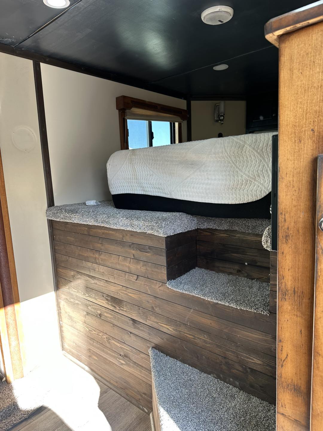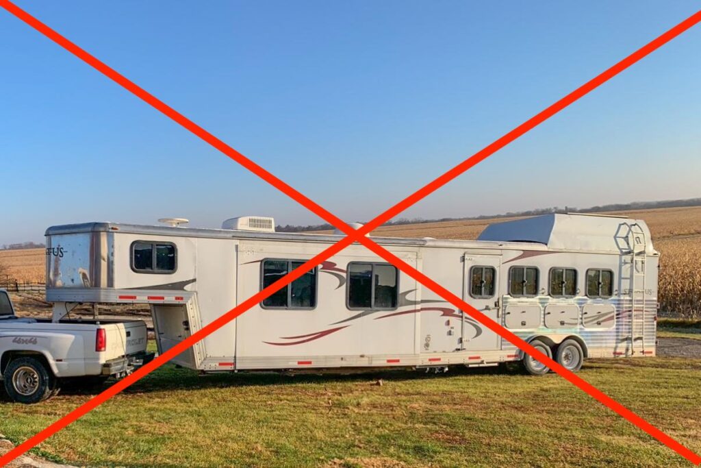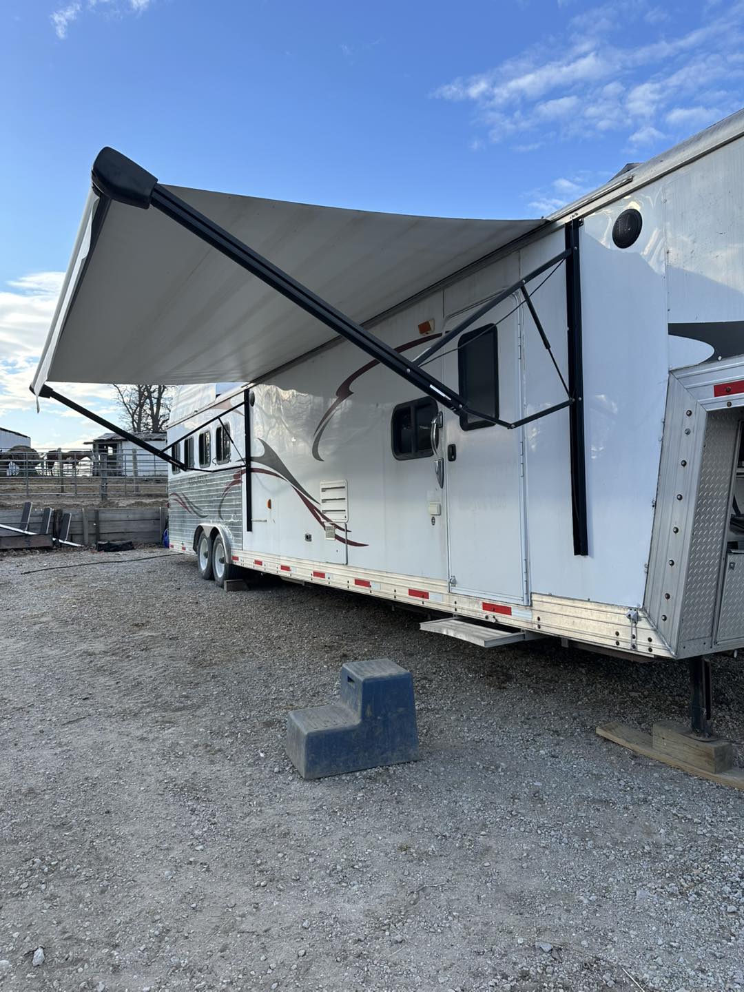2008 Bison Stratus aluminum 4 horse trailer with full living quarters. This trailer is the highest end model for Bison and packed with extras! It has dual hydraulic jacks, air ride, an 18’ power awning, indoor outdoor speakers with Bluetooth stereo, a full sized fridge, full bathroom, ducted ac and heat, and a powered mega slide out. The slide out holds a dinette that folds into a bed plus a couch that pulls out to a full sized bed. There is lots of storage and plugins that were added when we had the LQ gutted and professionally redone in 2022. The roof was redone then and sealed in 2024 again. For the horse area there are drop down windows on the front with bars, and sliders on the butt side with bars. It has 3 managers with storage below, a stud wall and pass through door from the horse area into the bathroom as well as a hay pod with hook ups for an additional water tank as well. We put new tires on in the Fall of 2024 that have less than 100 miles on them! This is a very fun trailer for camping or rodeoing in comfort!