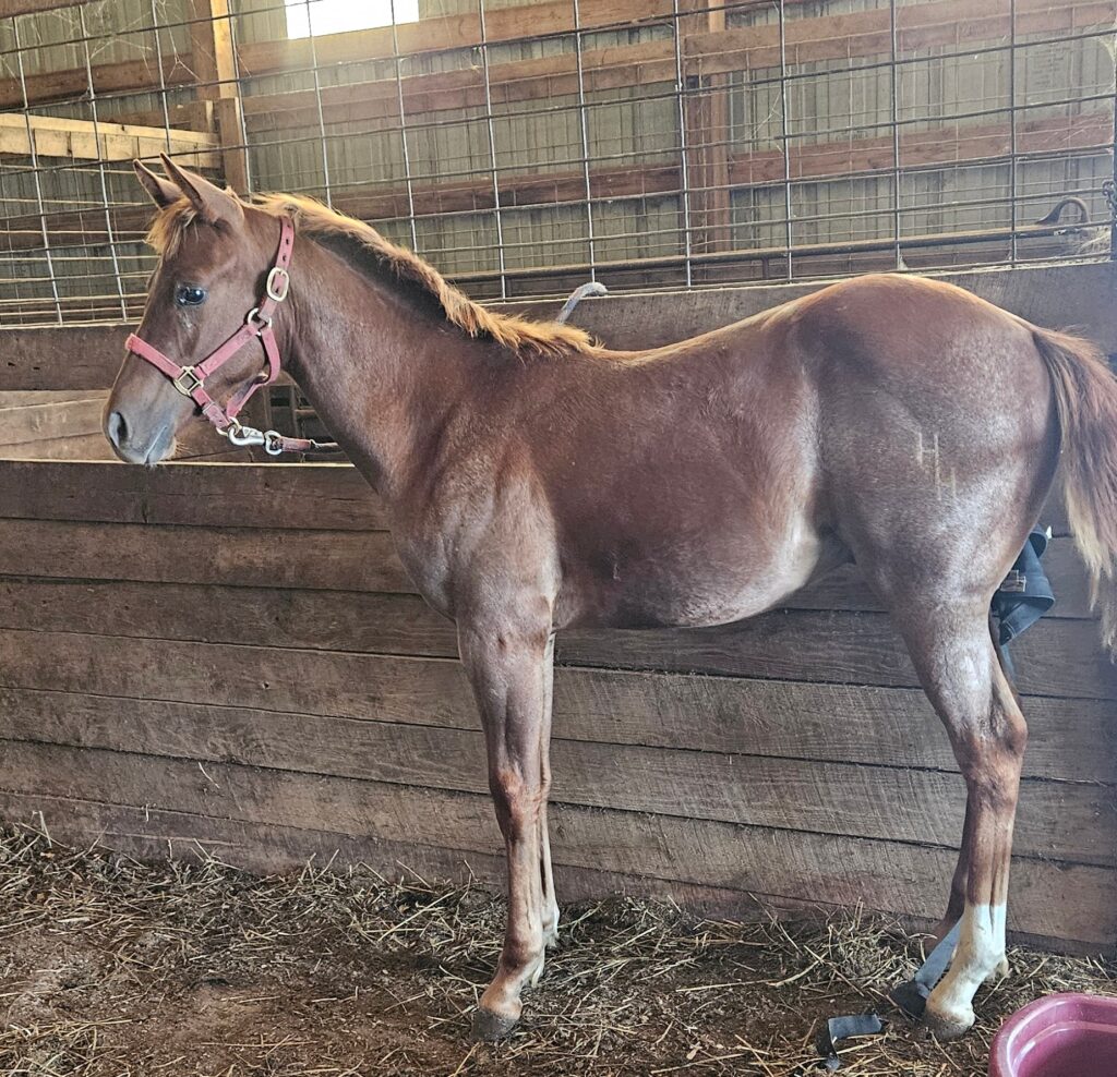 Bell, a red roan Quarter Horse weanling stallion colt. Sire and dam are money earner producers and foal is eligible for IQHA ranch futurity. He will be a big solid ranch type horse with wonderful foundation bloodlines. These foals are quick learners and easy going. Registration pending.