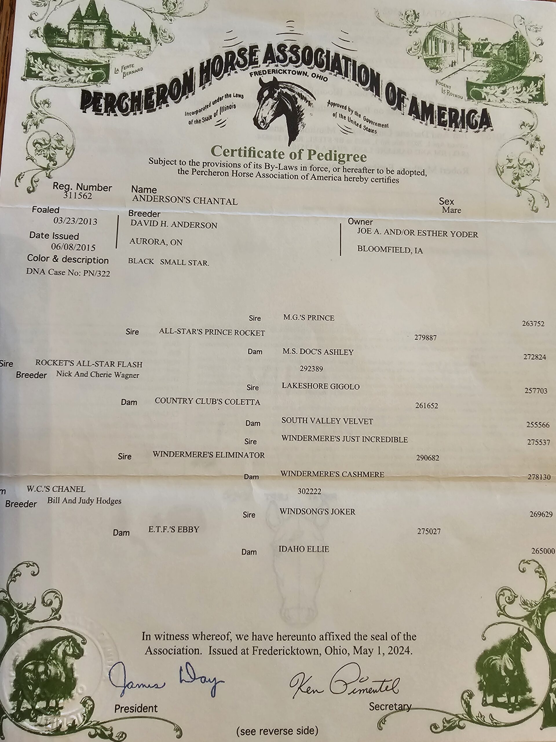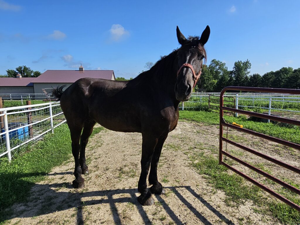 Anderson’s Chantal #311562, a registered 12 year old black Percheron mare with star. Stands approx 17.2 hands. Open. She is a nice mare and has nice colts and is a good mom. She has been driven. Traffic broke.