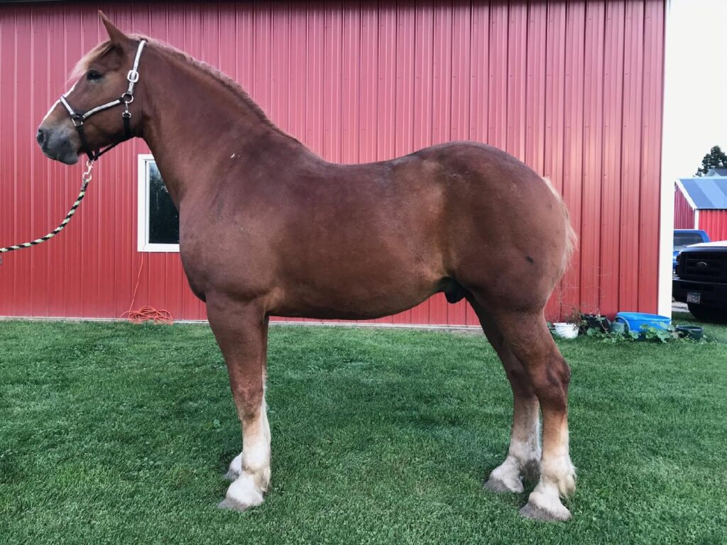 Chip, a 14 year old grade Belgian gelding, dark red sorrel, with strip and red mane and tail, standing 17.1 HH. He drives single, double, on either side and is traffic broke. We have used him for carriage rides and in parades. Shoes with out a stock, stands good for the farrier, likes a bath.