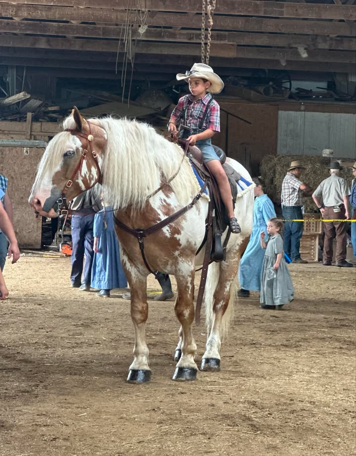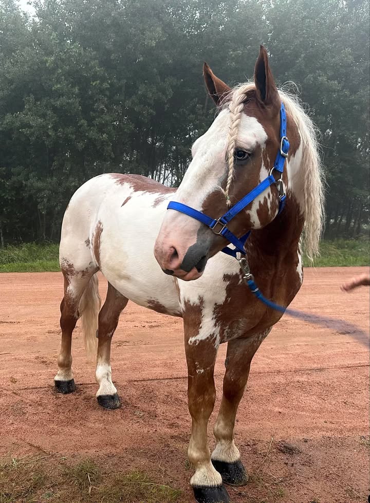 Chuck is a 5 year old, grade red roan and roan Spotted Draft Gelding. He stands 16.2 HH and is broke to ride and drive, single/double and on either side. He is broke to all farm machinery. He has been in the carriage, on trail rides, has cultivated the garden and mowed the lawn. Chuck is a nice, quiet gelding safe for the whole family.