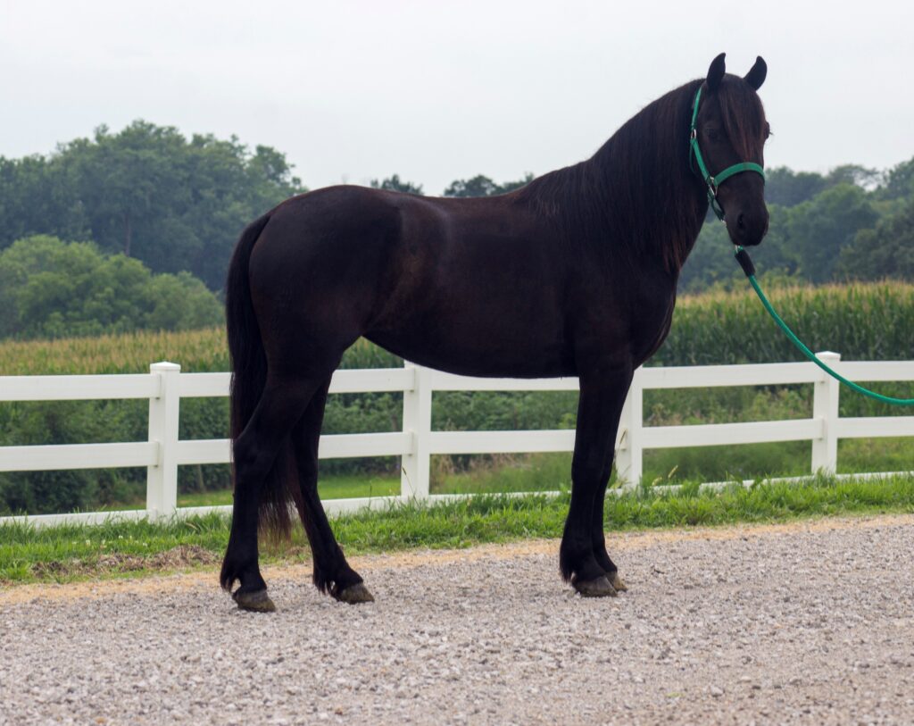 Envy, a black 2 year old grade Pony mare. Stands approx 50″. She is broke to ride and drive, easy to shoe and clip 100% sound.