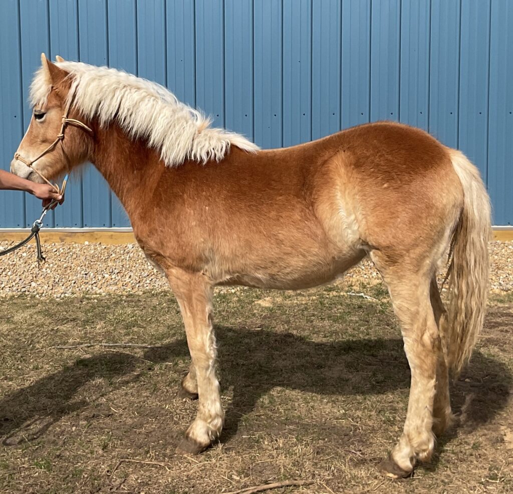 Gertie, a grade yearling blonde Haflinger filly. Broke to lead. She is easy to catch in the pasture.