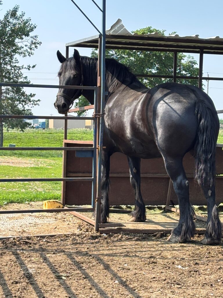 Hanks Ace, a 10 year old registered solid black Percheron gelding. Stands approx 17 hands. Ace lost his team mate. He has been used for carriage rides mostly, parades, weddings, and wagon trains out west. He did spend one spring and summer in Tripp, SD with the Amish.