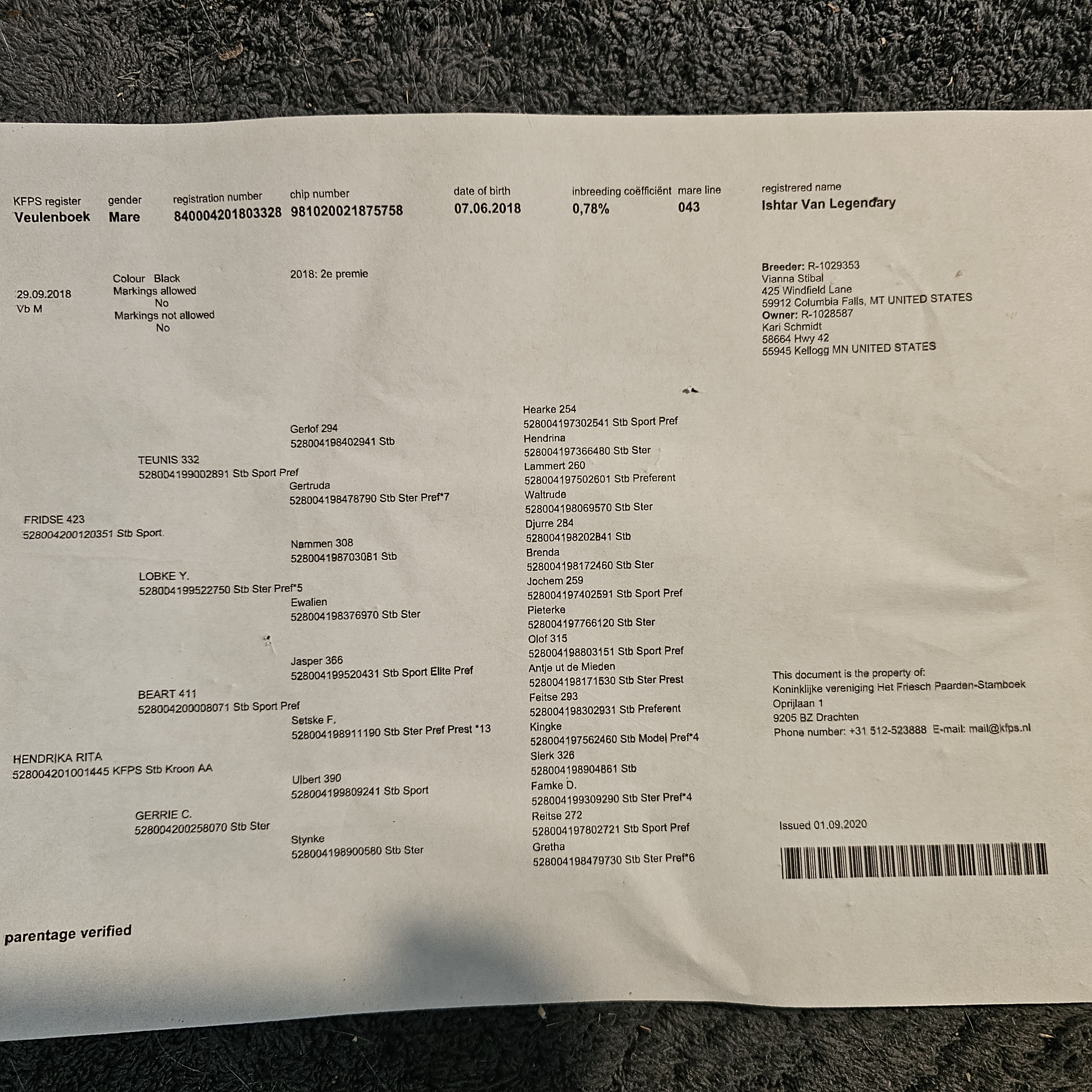 Ishtar Van Legendary is a breathtaking 7-year-old black Friesian mare, standing over 17 hands, and broke to drive. DNA-tested clear for dwarfism and hydrocephalus Currently in foal to the Friesian stallion Reider for a 2026 purebred foal. Exceptional pedigree, gentle disposition, and impressive presence make her a rare find for breeding and driving. She did have surgery on her hock at age 3 to have a bone chip taken out at Ames Veterinary thus hock does have scar. She has had one beautiful filly foal. Excellent mother. 507-251-1909