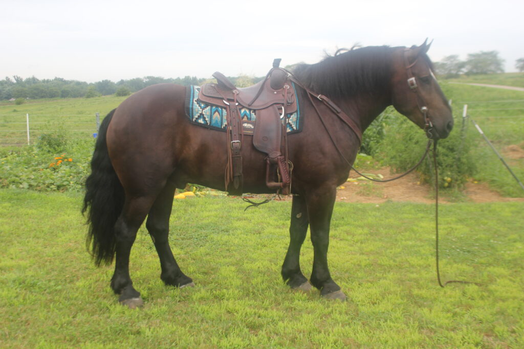 Jimbo is a grade, 4 year old, approx 16.2 HH Percheron gelding that is black with a star with a long tail. He is traffic broke to ride and drive-single/double and on either side. He is broke to all farm machinery. He has been on the trails, crosses water and logs. Jimbo has been in town and will go where you point him. He would make a good carriage horse. He is very quiet and gentle. FMI: 641-895-2223