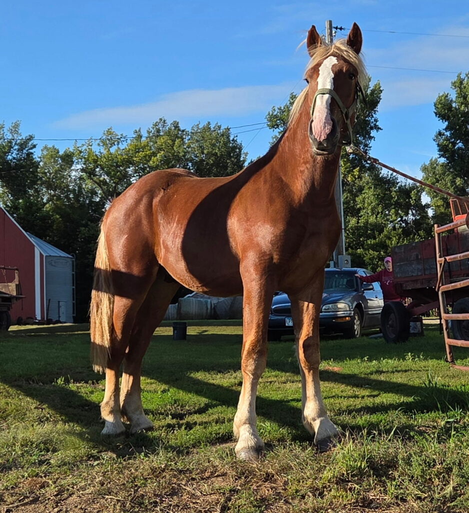 A grade sorrel Belgian yearling stallion with a strip, and light mane and tail.
