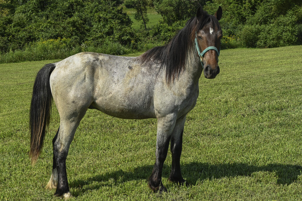 A Yearling Blue Roan Gypsy Friesian Cross Stallion.Halter broke and loads nicely onto trailers. Registration pending