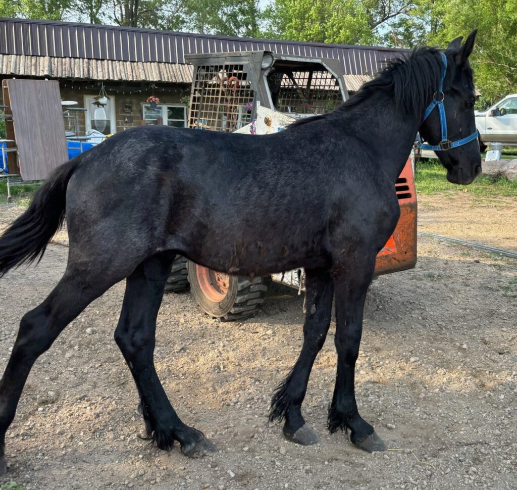 Onyx is a Percheron Friesian x gelding yearling. He has a thin star, strip, pink snip, and white around his back left hoof. He has a very sweet disposition. He is halter broke. He is a finey-boned colt. His Dam is dapple gray and stands 16.1 HH. His Sire is a blue roan named Samson and stands 17 HH.