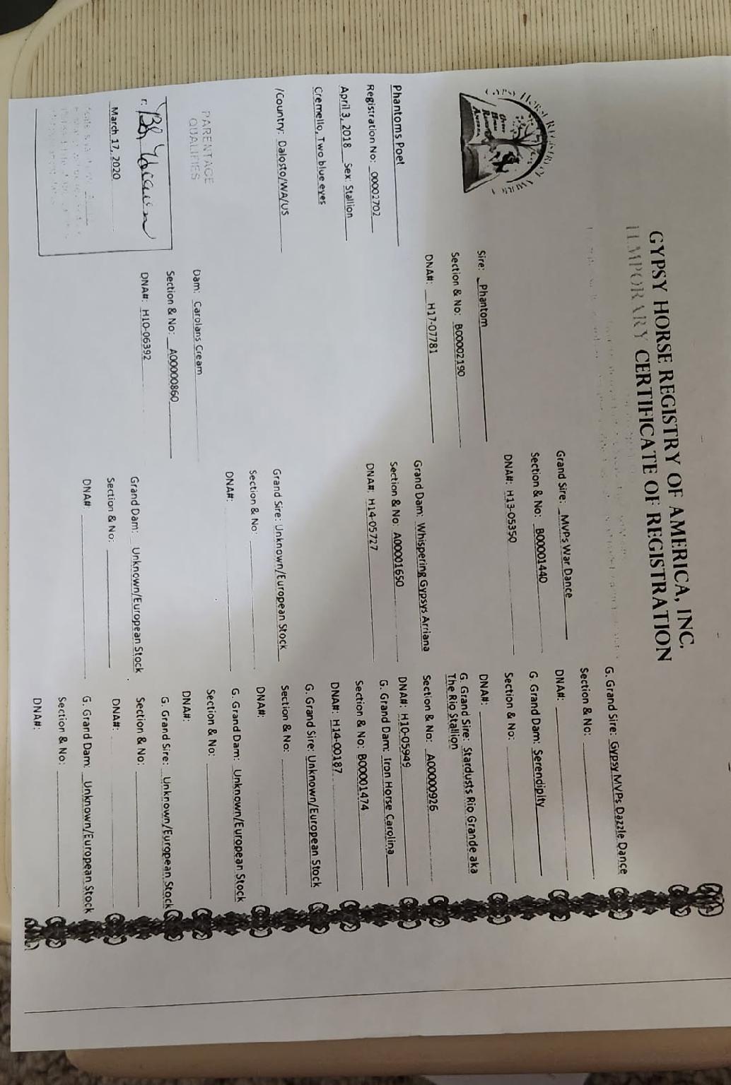 Phantoms Poet is a 7 year old registered Gypsy Vanner Cremello Stallion that is 14.2 HH. He rides and has been on lots of trail rides, where he crosses creeks, logs, and goes through the woods. He has also been on overnight camping trips, and is handy broke. Phantom’s Poet is very quiet around mares.