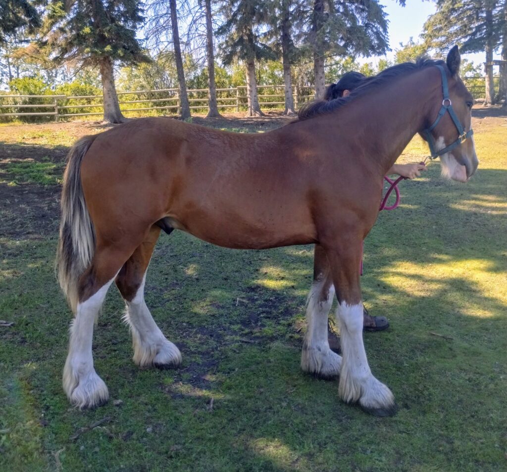 T.H.E. Megladon is a 16 month old registration pending Drum Horse gelding. He will come with transfer papers. He is 50% Clydesdale, 25% Shire, and 25% Gypsy Cob. His sire is 16 HH and his dam is 16.2 HH. His dam is a full Clydesdale whose parents are both over 17.2 HH. She consistently produces large foals so we are expecting him to be larger as well. If you have ever wanted to ride or drive a Clydesdale but wanted something slightly smaller this is your chance. This sweet boy was bred to be an athletic riding and driving horse who could potentially do well in any discipline you like.
